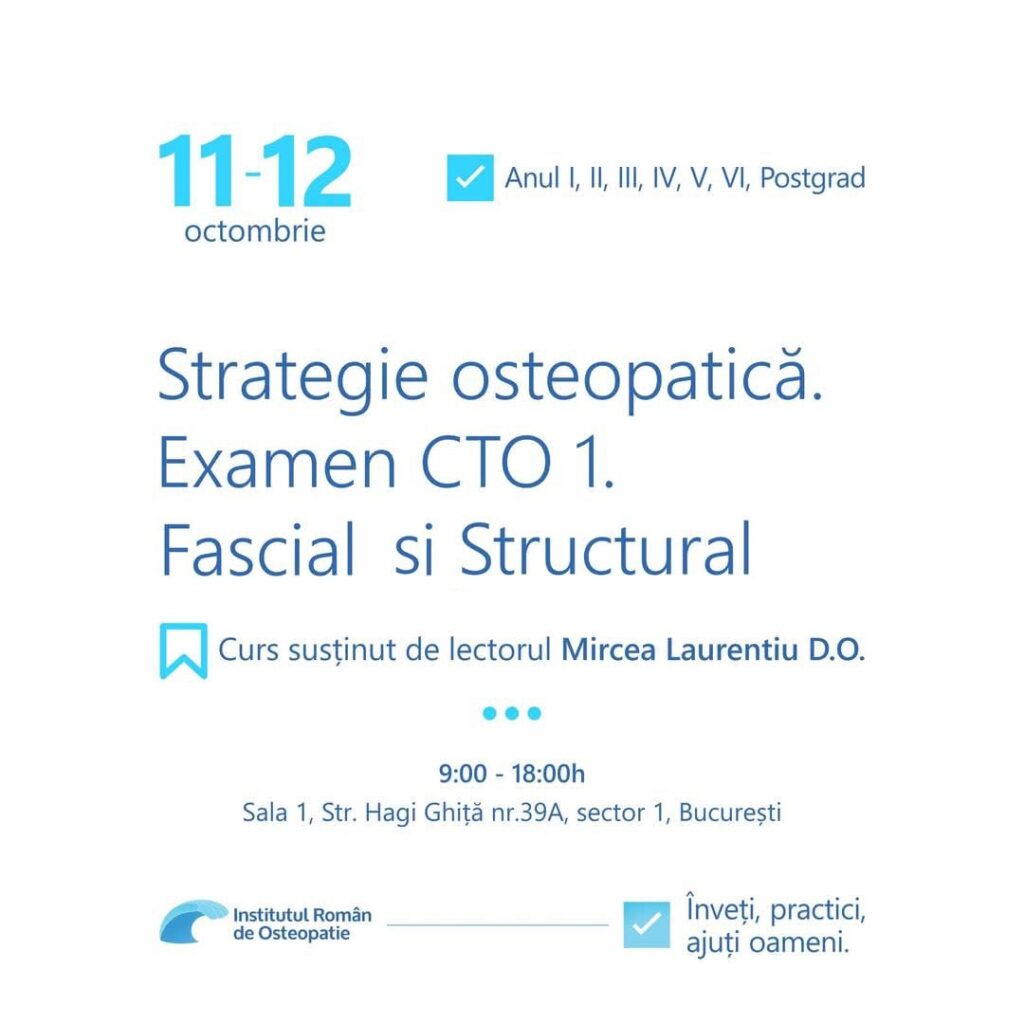 Activitatea va avea loc sâmbătă 11 octombrie, și duminică 12 octombrie 2025, între orele 9:00 și 18:00, în Sala 1, situată pe Strada Hagi Ghiță nr. 39A, Sector 1, București. Prima zi va fi dedicată recapitulării semiologiei pentru pregătirea examenului CTO, cu accent pe integrarea noțiunilor teoretice și pe clarificarea strategiilor de evaluare și intervenție osteopatică.