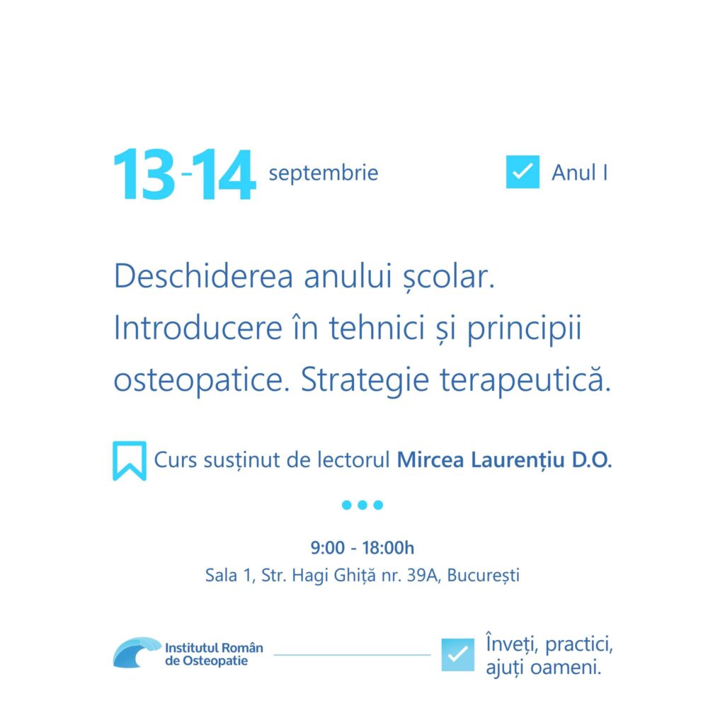 În weekendul 13–14 septembrie 2025, între orele 9:00 și 18:00, la Sala 1, Str. Hagi Ghiță nr. 39A, București, are loc deschiderea Anului I al programului de formare 2025–2026. Modulul inaugural, „Introducere în tehnici și principii osteopatice – Strategie terapeutică”, va fi susținut de lectorul Mircea Laurențiu D.O. și marchează primul pas în înțelegerea și aplicarea bazelor osteopatiei.